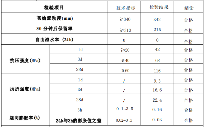 ➢28天强度:20℃条件下材料28天抗压强度大于116MPa;