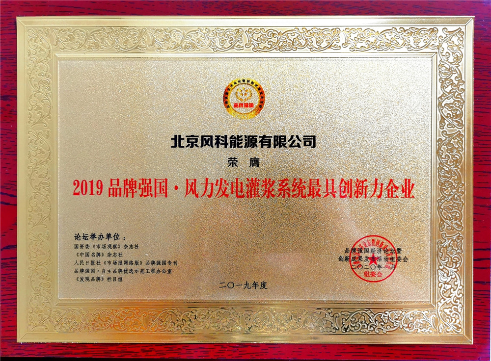 风科能源“风科Fincke™340” 风电专用灌浆料 品牌荣获2019品牌强国经济论坛暨(第三届)创新成果发布活动大奖